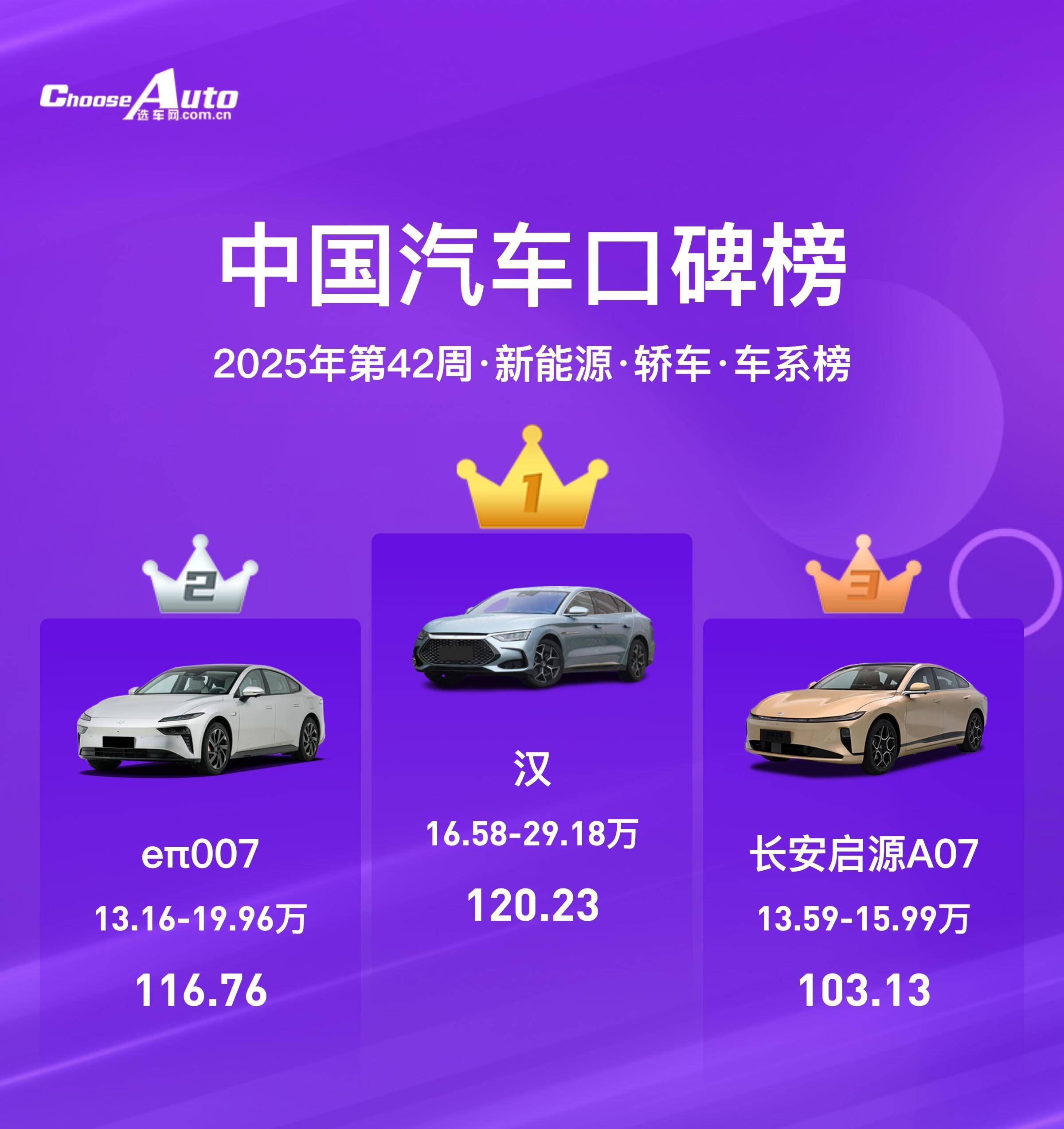 在新能源轿车榜单中,比亚迪汉以16.58-29.18万元的价格区间占据榜首,尽管出现“err007”提示,仍保持较高的热度。长安启源A07紧随其后,定价13.16-19.96万元,口碑数据为120.23,表现稳健。秦PLUS则以13.59-15.99万元的价格和116.76的口碑数据,进一步丰富了该细分市场的选择。