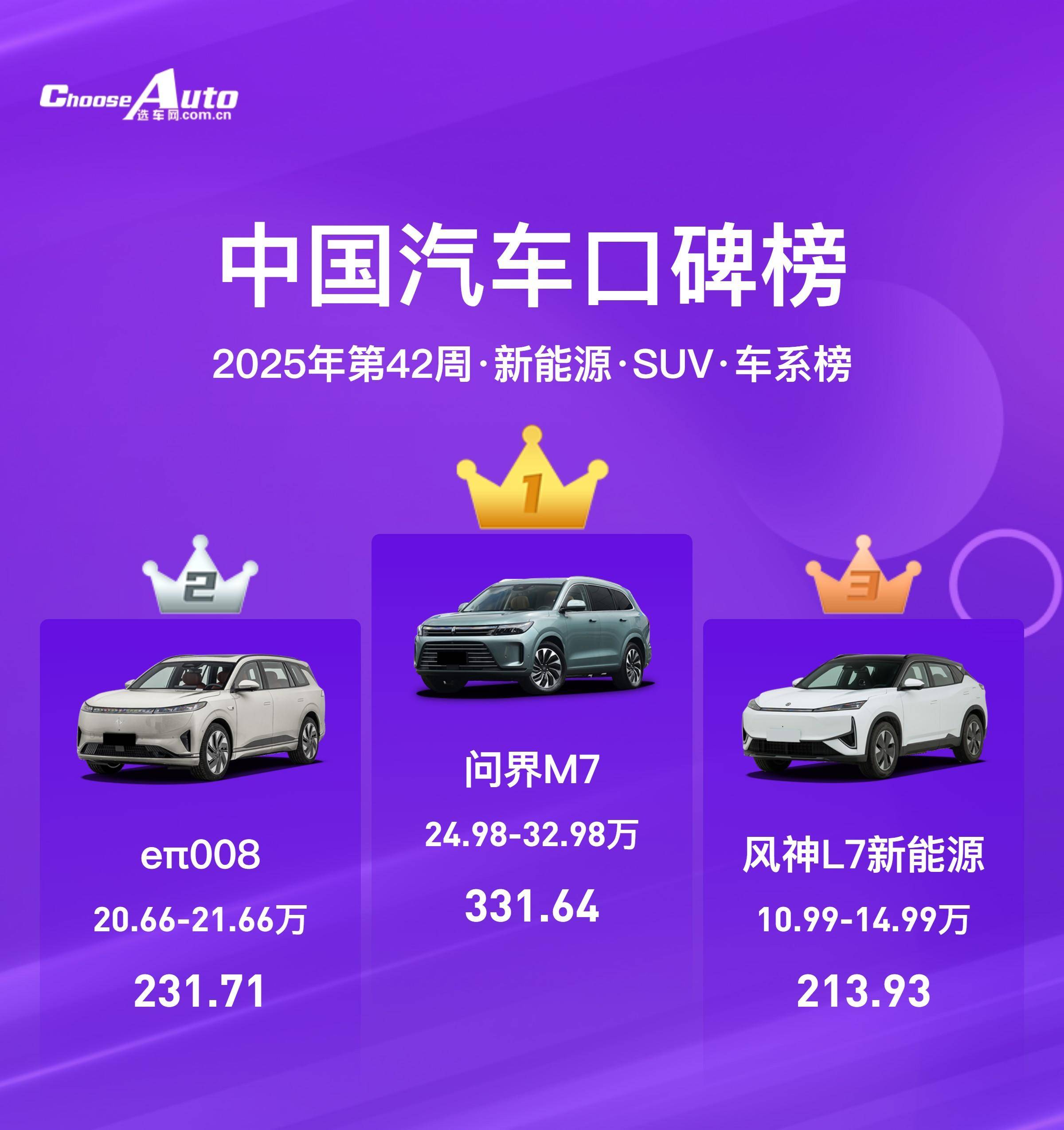 在新能源SUV榜单中,问界M7以24.98-32.98万元的价格区间占据前列,尽管出现“err008”的异常提示,仍显示出较高的关注度。风神L7新能源紧随其后,定价在12.99-15.99万元之间,口碑数据达331.64,表现突出。此外,多款10-15万元区间的车型如长安启源A05等也积累了不错的用户反馈,反映出该价位段市场的活跃程度。