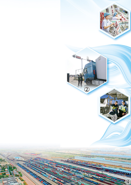 图①:新疆某企业生产的产品远销阿联酋、新西兰、泰国等国家。何 龙摄 图②:霍尔果斯海关关员服务保障商品车出口。王白瑜摄 图③:阿拉山口海关关员对铁路口岸运输工具开展监管。张昭晖摄 图④:繁忙的新疆阿拉山口站编组场。陈 乾摄
