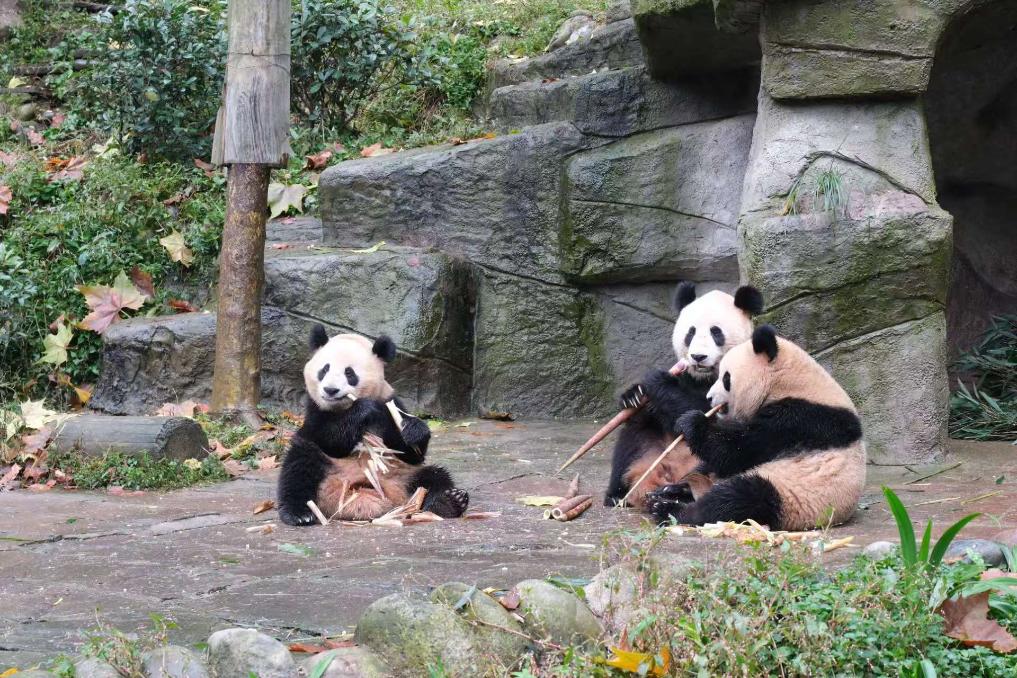 11月4日,大熊猫“汪佳”一家正在吃竹笋。新华社记者 边思琪 摄