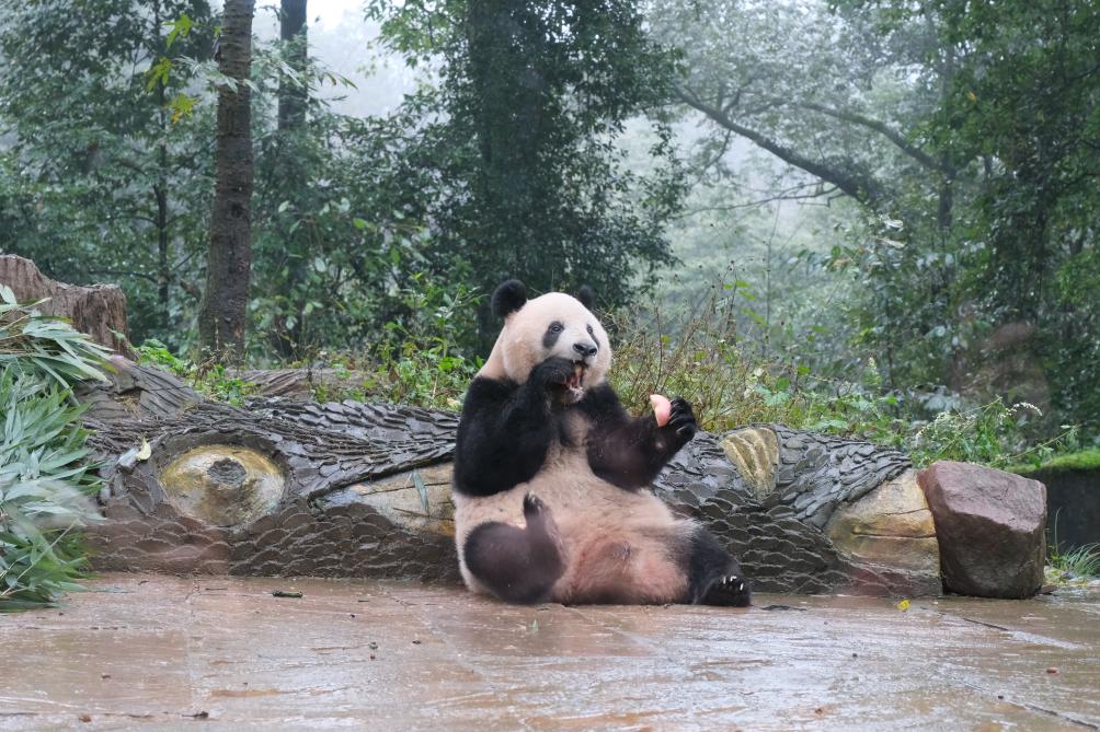 在中国大熊猫保护研究中心雅安基地的熊猫幼儿园里,饲养员肖永莉正忙碌着为双胞胎大熊猫“佳雨”“佳雪”和它们的妈妈“汪佳”备餐。她熟练地劈开竹竿,摆放好竹笋,一切准备就绪后,闸门打开,圆滚滚的大熊猫跑了出来。